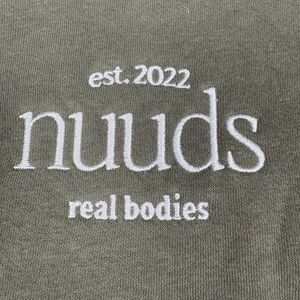 Nuuds Real Bodies crewneck sweatshirt in olive green, size XL. Features embroidered chest logo (est. 2022, nuuds real bodies), soft fleece lining, and a relaxed, boxy fit. Premium weight cotton blend with ribbed cuffs and hem. Cozy layering piece that nails the clean, minimal aesthetic Nuuds is known for.