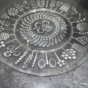 Beautiful platter molded glass dimensional on the backside. Measures approximately 15 1/4 to 15 3/8” across widest.