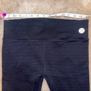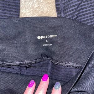 Nux for Pure Barre Black Ribbed High Compression Ankle Legging. Wide waistband doesn't have texture. Body has striped ribbing all over. Logo on front right side. Ankle length for me. Branded for Pure Barre.