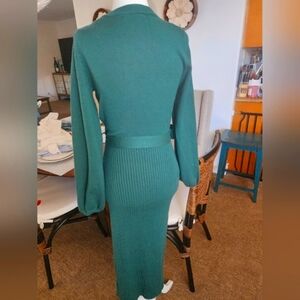 Elegant green knit sweater dress featuring a matching belt. Perfect for a stylish and cozy look- LOVE the sleeve! ribbed on the bottom half- it's really stretch so it's not the best shown on mannequin. overall length 45" shoulder to hem