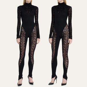 Mock Neck Logo Jacquard Tulle Jumpsuit/stretchy bodysuit