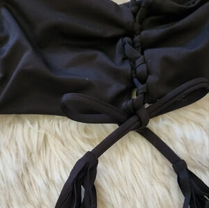 Wired on the sides with ruching. Lace up front with fringes at tie ends. New, never worn.