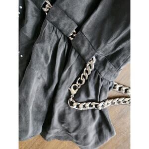 The product is a NWOT Coach mini skirt, made of 100% silk in black with embroidered details and a ruffled hem. It features a zip closure and mid-rise fit, suitable for various occasions such as parties, cocktails, or casual outings. The skirt is accented with chains, giving it a designer touch and a trendy look. Designed by Coach, this skirt is a stylish addition to any woman's wardrobe, perfect for all seasons.