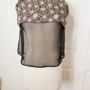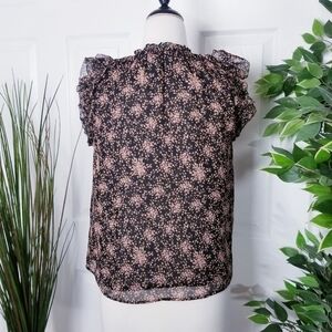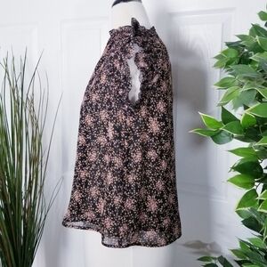 This black top from Generation Love has tiny pink & peach flowers adorning this high neck blouse with on-trend fluttery sleeve details