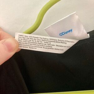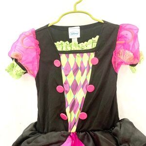 Officially Licensed Disney Alice in Wonderland Mad Hatter Halloween costume. Size 3T-4T. Includes dress, hat headband, and footless leggings. This Disney Mad Hatter Costume features a multicolor dress with green and purple diamonds down the center of the black bodice framed by pink buttons with pink mesh sleeves and green doily trim. A dainty black peplum waist extends over the satin and mesh layered pink skirts with colorful teapots decorating the pink mesh; black tulle is the bottom most layer of the skirt. A hat headband and purple and green diamond footless tights complete your whimsical look. Dress is a pullover. Made of 100% polyester (body), 100% nylon (pink organza), exclusive of decorations.