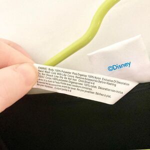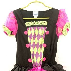 Officially Licensed Disney Alice in Wonderland Mad Hatter Halloween costume. Size child's small (4-6). Includes dress, hat headband, and footless leggings. This Disney Mad Hatter Costume features a multicolor dress with green and purple diamonds down the center of the black bodice framed by pink buttons with pink mesh sleeves and green doily trim. A dainty black peplum waist extends over the satin and mesh layered pink skirts with colorful teapots decorating the pink mesh; black tulle is the bottom most layer of the skirt. A hat headband and purple and green diamond footless tights complete your whimsical look. Dress is a pullover. Made of 100% polyester (body), 100% nylon (pink organza), exclusive of decorations.
