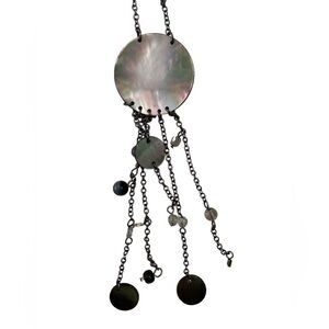 This new without tag Joan Rivers neck and earrings set features mother of pearl disks with 5 delicate gunmetal chains hanging from each disk. Chains have crystals & beads. Delicate. Lustrous. Lobster claw closure. Rare find. Main disk is 2 inches round. 16 inch with 3 inch extender. Marked. Dangling. Nwot comes with gift box. Could be vintage.