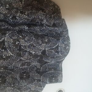 condition is New without the tags and never worn or washed no issues noted, 3/4 full sleeves feature roll tabs, hardware under neckline creates keyhole effect, 100% polyester black with gold and white with specks of blue pattern, size 3X measurements are roughly 30" from shoulder to hem and about 25" pit to pit, pet friendly non smoking home