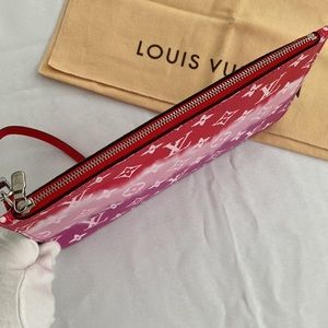 Authentic, LIMITED EDITION, Louis Vuitton Escale Neverfull MM Pochette. Beautifully done in Ombre hues of red, purple and pink. Red carrying strap, red interior lining. Inner slip pocket. All silver hardware. NWOT. Never carried. Includes dust bag only. Guaranteed authentic. Spain. GI0270. #0206V690A. This listing is for one Pochette only. Look for the other pochettes as separate listings in my closet. Thank you.