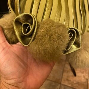 Beautiful green dress blazer. Fully lined, long sleeves, 1 beautiful button closure in front. Bottom has rosettes and real fur balls all the across front hemline. Measurements are taken lying flat non-stretched