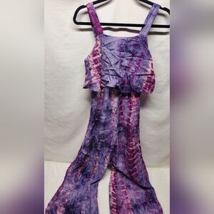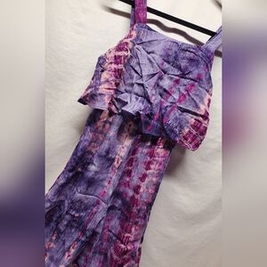 Stylish tie-dye jumpsuit in purple and pink. Features a sleeveless design with wide legs. I don't see a size but im guessing a M