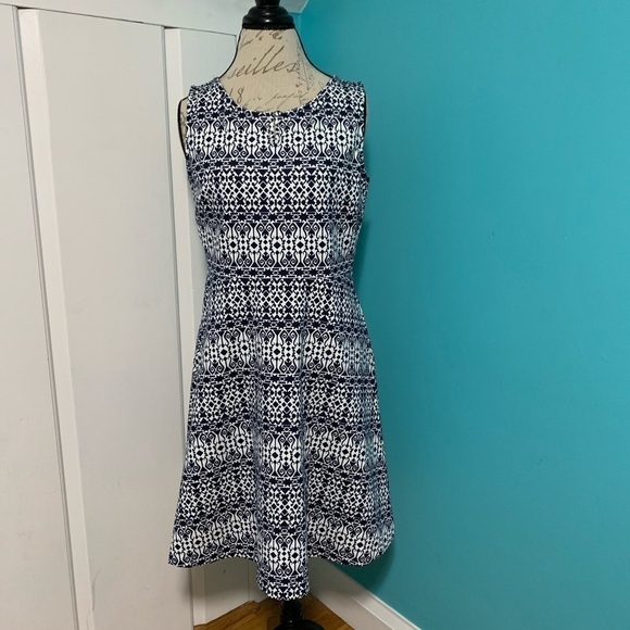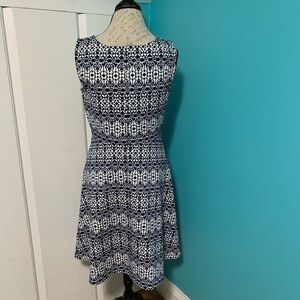 NWOT A classic A-line dresseith a modern geometric print. Keyhole accent on chest. Hidden back zip with hook and eye closure. Unlined. Mid-heavy weight fabric: 85% Polyester, 10% Rayon, 5% Spandex. Machine wash, flat dry. Measures approximately: 18 1/4” armpit to armpit, 38 1/2” shoulder to hem. Manufacturing defect, is at keyhole the way the fabric is stretching the print. Shown in last pic. Navy and white print.