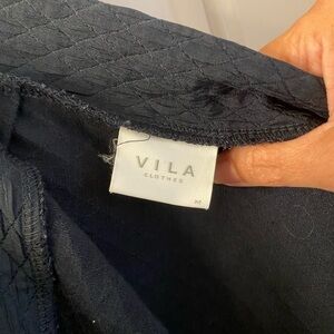 Women black quilted style skirt. It is a vimounta skirt design. Made by Vila Clothes in Turkey it is medium size, 58% cotton, 33% polyester; 3% Elastana measurements are 15’ waist; 17’ long Pristine condition, no stains or tears. Has a side zipper in working conditions.
