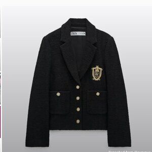 Nwot Zara Tweed Black Blazer Textured Patch Pocket Emblem Gold ButtonsCropped L