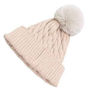 Nwot beige cable knit super-soft hat tan fur Pom Pom one size