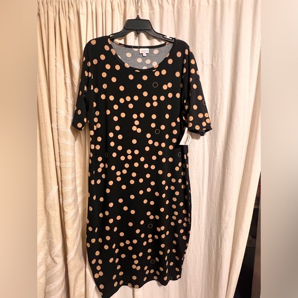 NWT it’s a 3xxl but it’s a bodycon style dress if you want a more relaxed loose fit this could fit 1x-3xl it’s super stretchy! It’s black with tan spots