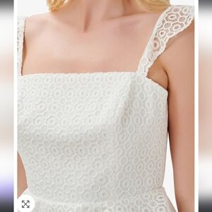 Make a stunning entrance in our flirty fit-and-flare dress designed in a dainty lace pattern. We love the playful flutter cap sleeves and the adorable flounce along the waistband and hemline for a feminine finish. Square neckline. A perfect little white dress for all your bridal events and soirees.