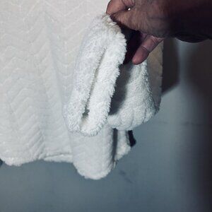This is a gorgeous white, super soft hooded sweater. Feels like a blanket. Rounded bottom.