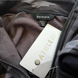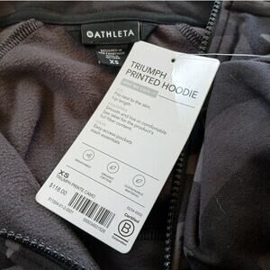 You're looking at a brand new with tags Athleta Triumph Printed Hoodie in Black Camo, size XS! This hoodie is not only stylish but also provides elemental protection, fitting next to the skin and hitting at hip length for a comfortable feel.