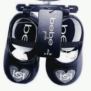 NWT Bebe Infant Girls Crib Shoes Ballet Flat Black with Silver Glitter Embroidered Heart Logo Size 3