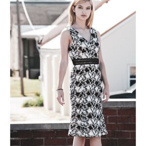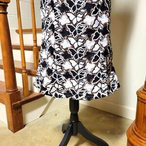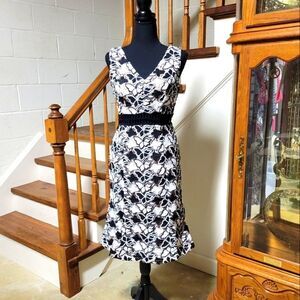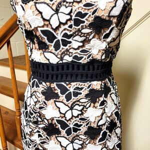 A beautiful black and white form fitting dress with a little flare at the bottom.