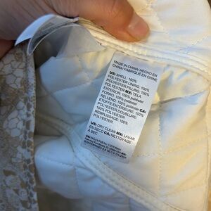 Brand new with tags. Gorgeous beige and white lace pattern quilted button front jacket. So pretty and perfect for spring. Chicos size 3 = womens 16/18