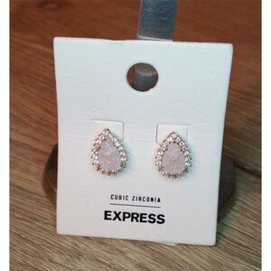 Express CZ earrings with faux opal like stone center, elegant teardrop shape.