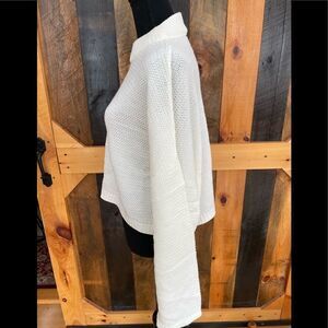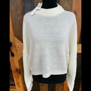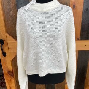 NWT Express white knit crop sweater, boxy oversized fit with drop sleeves, sz XL. High neckline, looser knit, semi see though; might need a tank or cami under, acrylic blend. Relaxed fit, approximate measurements are 27, length from shoulder approximately 19”.