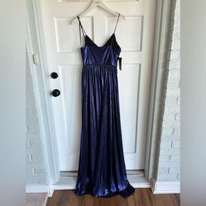 Nwt Free People Retrofete Doss Dress Midnight Sky Blue Metallic Slit Maxi Gown