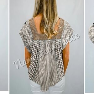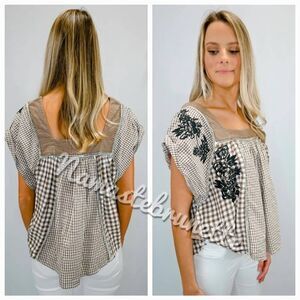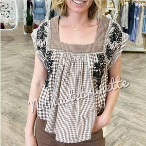 Fluttering sleeves frame this breezy cotton top styled with flowery embroidery and lively brown mixed checks.