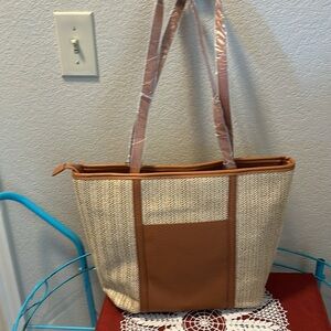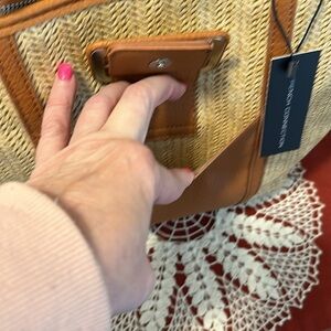 Nwt French Connection Tote Bag. Straw material, double handle, zip closure. Very roomy with pockets on outside and inside. Height 12.5” without straps. Height with straps 24”. Width 5.5-6”. Length 14-15”.