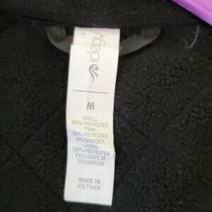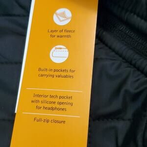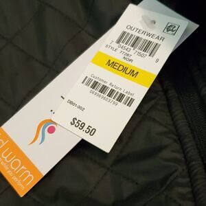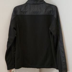 New with tags. Inside is fleece. The front is a quilted look. 2 outside zipper pockets and 1 inside pocket. Full zip black jacket size medium. See all pics.