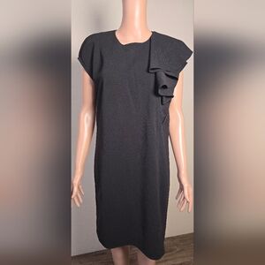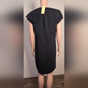 This chic black mini dress by Jade features an asymmetrical ruffled design, perfect for cocktail events or work. The sheath silhouette with cap sleeves offers a modern and sophisticated look, making it a versatile addition to any wardrobe.