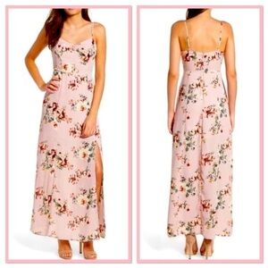 Floral print puts a summery spin on a flowy maxi dress with a flattering cinched V-neckline, while a deep slit adds a flash of leg with every step.