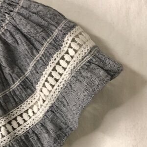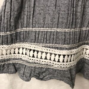 NWT Listicle Women’s Sleeveless Top Ruffle Elasticized Neckline for off shoulder. Embroidered trim. Gathers throughout bodice. Gray print Size Small. Side Pockets. Darling Brand new Top!