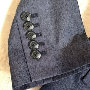 New Liz Claiborne denim blazer. Including navy buckle belt. Has some indents on the belt but this blazer would go with any belt of your choice. Three button closure. Two buttoned pockets. Buttons on cuff. Sleeves are lined. Has stretch.
