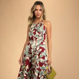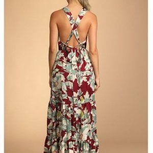 Nwt Lulu's Boho Burgundy Floral Print Tie-Back Tiered Maxi Dress