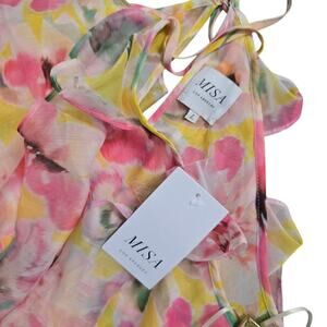 New with tags Misa Los Angeles Dress large Multi Layers Pinks Yellow Green in an Abstract Floral print with a Multitude of Chiffon Ruffles