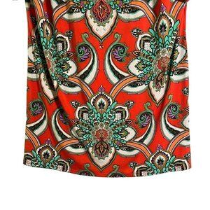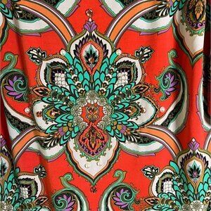 NWT Madison Global Glamour Paisley & Floral Print Sequined Beaded Top Size XL is so beautiful and will make you stand out in a crowd. This lovely orange and green stretchy tunic with green and pink stone embellishments also has has white pearl like beads. Don't miss the scoop neck with button keyhole back closure. Really Comfortable And Stylish. Size M. Great Condition. Measurements are approximate. Bundle items for a discount.
