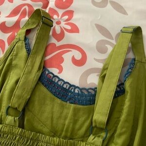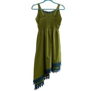 Breezy and boho-inspired, this dress showcases delicate Moroccan blue crochet that pops against a verdant background. An elastic waist offers comfortable figure definition, and an asymmetrical hem finishes off the look with free-spirited flair.