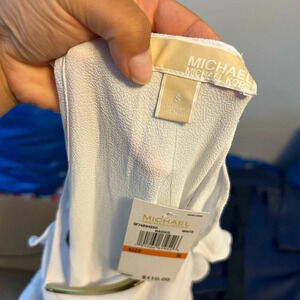 Brand new with tags. Adorable white ruffle cold shoulder blouse with gold metal Michael Kors branded neckline. Womens size small.