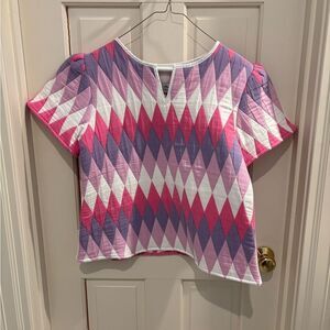 Stylish top with a geometric pattern in pink, purple, and white. Features short sleeves and a round neckline.
