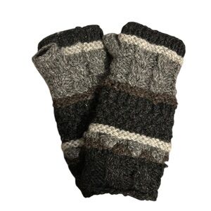 Brand new with tags. Warm and stylish knit fingerless gloves. Features a mix of dark and light gray tones. These are 100% wool and knit in Nepal. One size.
