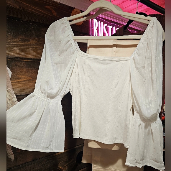 this is so darn cute!! paired with blue jeans or denim shorts and cowgirl boots 👢 💙 so cute! the sleeve is a frosted sheer color with a bell sleeve on the end!