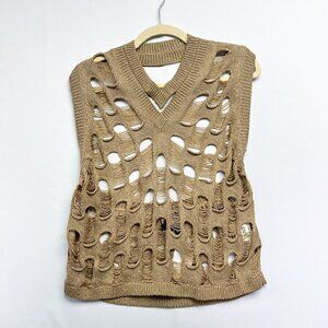 Double v neck open stitch sleeveless top in a metallic gold color. Features an all over distressed like detailing and a flattering open back silhouette.