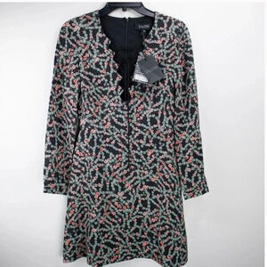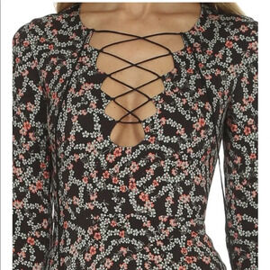Cherry blossoms create a chain across the serene black landscape of this long sleeve mini. Lace up detail creates a cage effect across the plunging neckline.