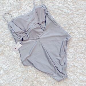 This sleek gray bodysuit from Sand & Shore offers a minimalist design with a smooth finish. Featuring a classic scoop neckline and thin spaghetti straps, it provides a versatile and stylish look. Perfect for layering or wearing on its own, this bodysuit is a wardrobe essential.