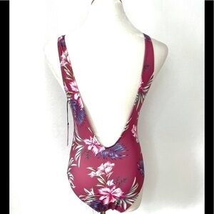 Effortlessly chic, swimsuit is perfect your beach or pool days. Deep V-neckline with strappy accents between the bust for confident wear. Plunging scoop-style back & cheeky cut completes the oh-so chic style. Removable cups help you get just the right fit. Perfect for pairing with your favorite cover-up, sandals & floppy hat for any adventure by the water. Maybe with a tropical green, pink, purple, blue, cream, & brown floral pattern. Built in bra support with removable padding. New with tags.