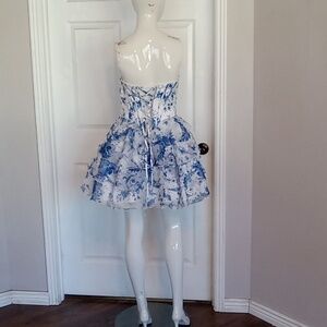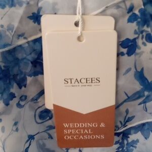 New with tags Stacees size 4 homecoming, prom, party, formal or any special occasion dress. Make a statement at your next event with this stunning blue and white strapless dress. boning corset top. tiered ruffle skirt. Perfect for any formal occasion, this dress combines elegance and style. lace up and zipper back