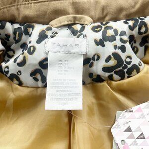Three piece outfit. Solid brown hoodie hooded long sleeve buttoned pea coat. White short sleeve shirt. Solid black leggings pants